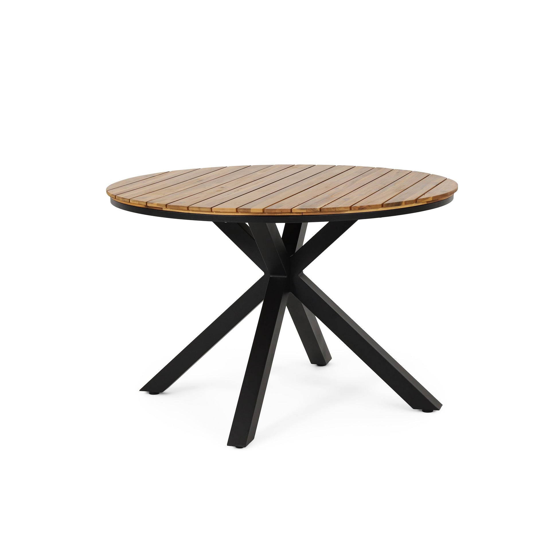 Set the tone of your next outdoor gathering with a well-chosen centerpiece. Crafted with a rich acacia wood top and a double X-shaped frame, our stunning dining table offers your backyard or patio space a sleek and stylish place to enjoy an afternoon barbeque or a hearty evening meal. This circular slat-panel table brings an impressive modern industrial atmosphere that can be easily matched with a variety of seating styles of your choice, making this the ideal addition to your home