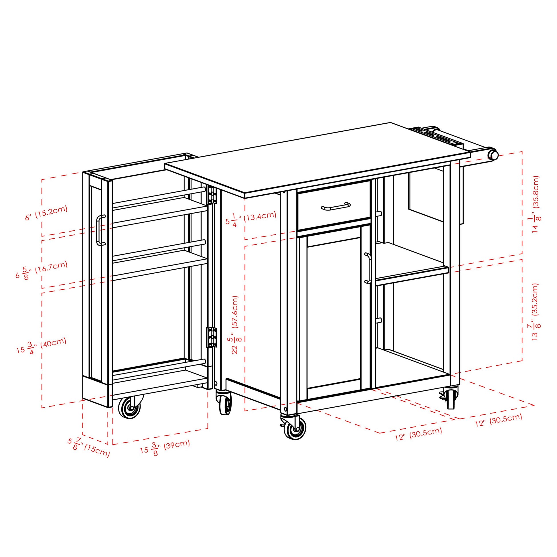 5.The cart features a swing-door cabinet with 3 side racks, and has a stabilizing 5th wheel and a locking device to keep the cabinet closed when needed. A cabinet with removable shelf, two open shelves, and a drawer offer plenty of storage.