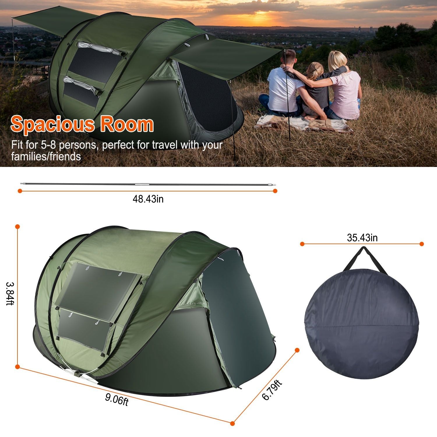 *Spacious Room*:With unfolding size of 9.06x6.79x3.84ft,the tent provides large and spacious space to contain 5-8 persons. Enjoy and share more wonderful time with your lovers,kids,friends,families,etc.. Dual inner pockets allow you to store some snacks or toys and hook on the top allows you to hang a light for illumination at night.