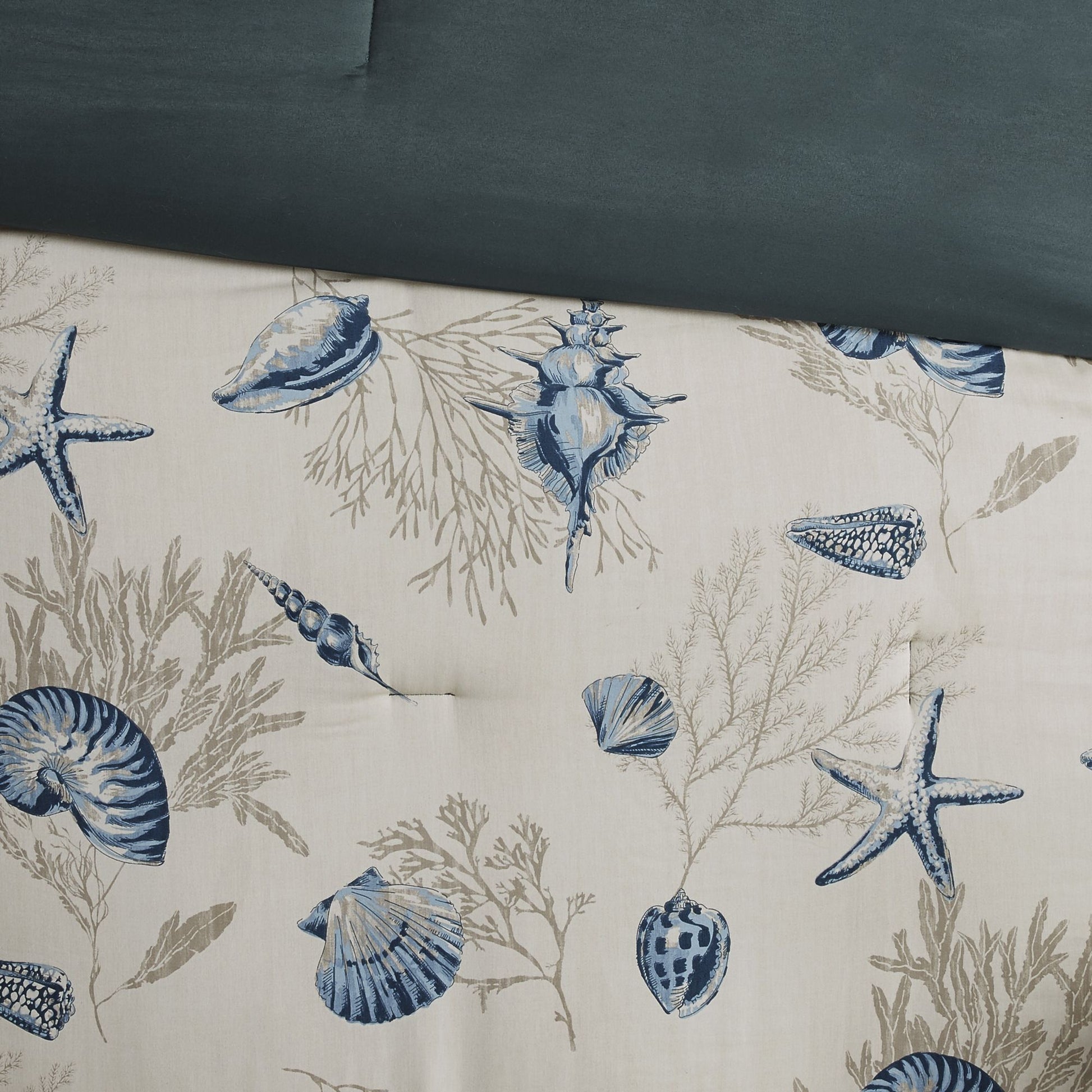The comforter and shams feature assorted seashells accentuated with light and dark blue coloring on an ivory baackground