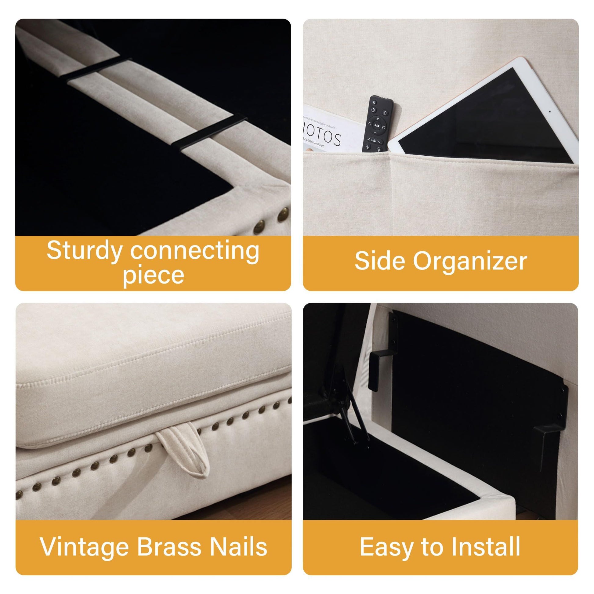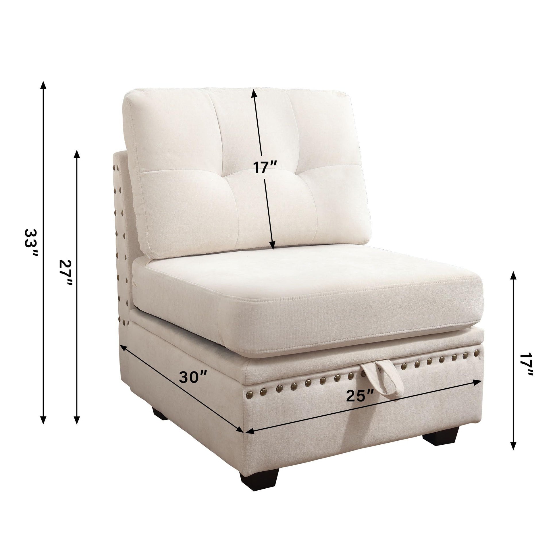 - Unique Design: 1: Adds vintage brass nails to each module, each one hammered in by hand by workers, giving the sofa a distinctive look from other modular sectional sofas. 2: Larger and wider seats (each module: 25x25x17 inch) provide more comfort space. Increase the hidden storage space (25*25*7 in³) in each sofa seat, enough to hold toys, blankets, decorations and more.