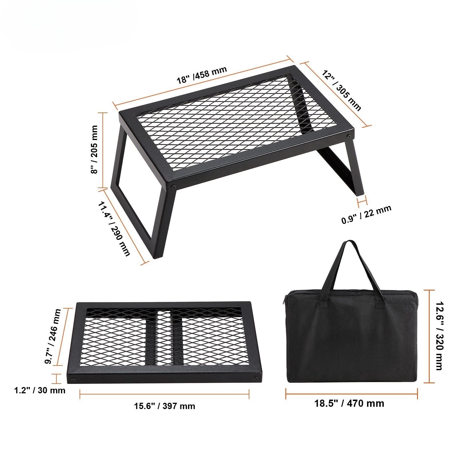 Foldable & Portable: This over fire camp grill boasts a foldable design and comes with a storage bag that is both wearable and beautiful to carry and protect the grill, making it easy to transport anywhere. It can be folded into 18"x12"x1.2" in 5 seconds, which is 6 lbs weight only.High-Quality Steel: The open fire grill is made of heavy-duty steel with a coat of paint on the surface, which is durable, food-grade, rust-proof, and high-temperature heat resistant. It can stand temperatures up to 572℉ / 300℃ without deformation and cracking. Load Capacity: 13 lbs / 6 kg.Sturdy & Stable: Unlike other thin legs, our over fire camp grill is durable and stable with thickened legs. It can accommodate multiple pots and pans, ensuring firmness while cooking and grilling.Diamond-Shaped Mesh: The folding campfire grill is designed with a high-density mesh grill, which can transfer heat efficiently and distributes heat evenly. You won't worry about dropping food if you want to cook bacon, eggs, toast, steaks, pancakes, sausages, or even pineapple slices.Multi-Purpose Use: Designed for outdoor cookware, frying pans, skillets, and pots, for cooking over an open fire. Widely used outdoors such as camping, hiking, picnic, traveling, backpacking, climbing, fishing, and other outdoor activities.